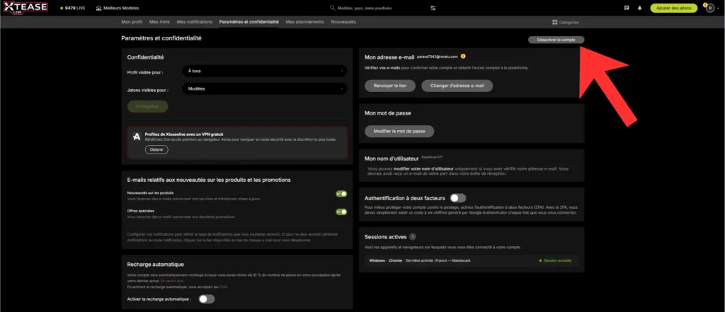 Se désinscrire de Xtease est relativement simple, à condition de savoir où chercher. Une fois connecté à ton compte, rends-toi dans le menu Paramètres et confidentialité accessible depuis ton profil. En haut de cette page, tu trouveras l’option “Désactiver le compte”. En cliquant dessus, Xtease te demandera de confirmer ton choix : la désactivation coupe immédiatement l’accès à ton compte, à ton historique et à tes interactions.