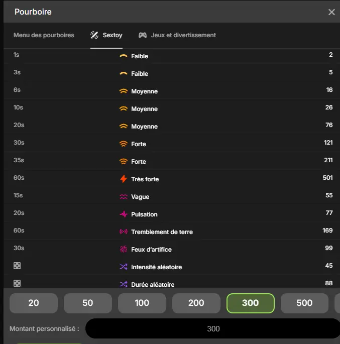 - Menus de pourboires ultra détaillés (intensité, durée, effets)