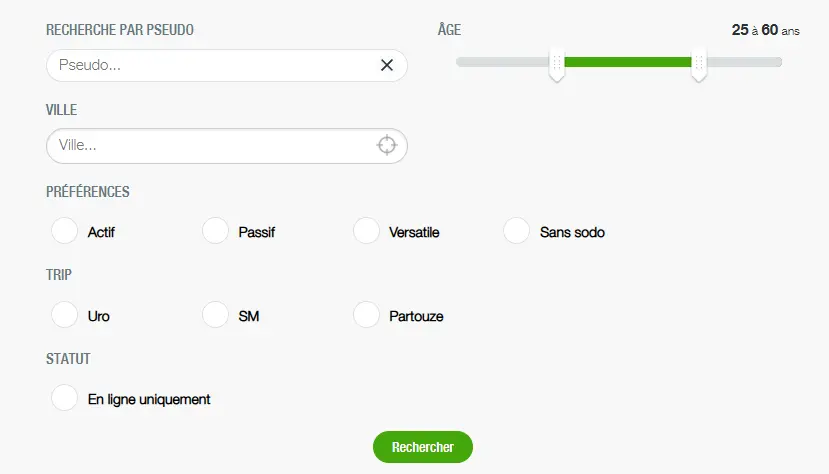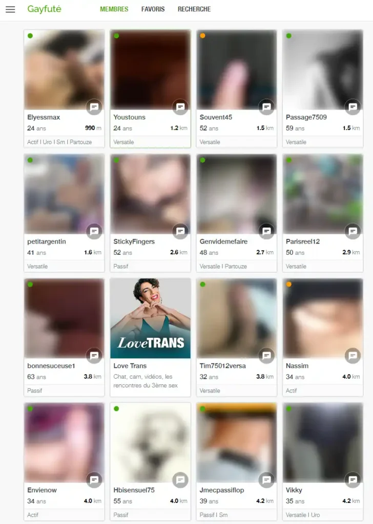 La recherche sur Gayfute est simple et efficace. Tu peux filtrer par pseudo, ville, âge, rôle (actif, passif, versatile), par type de pratique et même voir uniquement les membres en ligne. En quelques clics, tu trouves exactement le type de profil que tu cherches, sans perdre de temps.