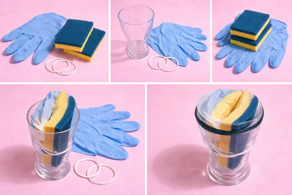 L’utilisation d’un verre ou d’un contenant rigide permet de maintenir l’ensemble et d’éviter que la structure ne se déforme. Le gant en latex, toujours indispensable, joue ici le rôle de barrière protectrice et de surface de glisse.