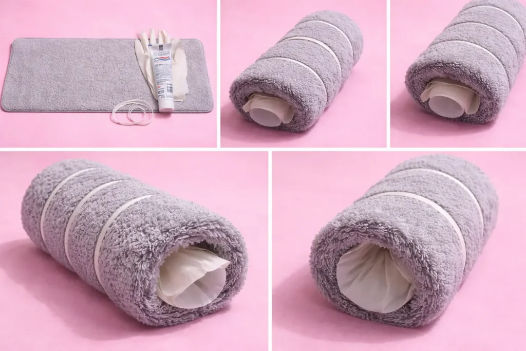 C’est sans doute l’une des méthodes les plus simples. Le rouleau, débarrassé de son tube en carton, devient une enveloppe souple. En y glissant un gant en latex bien étiré, on obtient une structure étonnamment flexible.